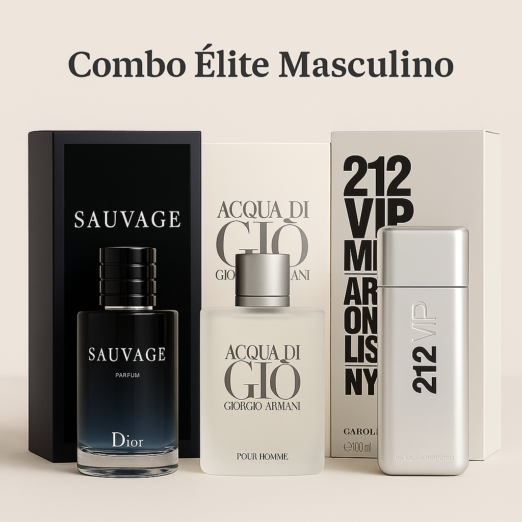 Combo Élite Masculino | Dior Sauvage 100ML | Giorgio Armani Acqua di Giò Pour Homme 100ML | Carolina Herrera 212 VIP Men 100ML